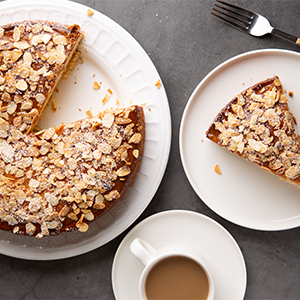 Faites dorer les amandes effilées à four chaud pendant quelques minutes tout en faisant fondre deux cuillères à soupe de miel dans une petite casserole. Enfin, nappez le cake du miel et parsemez le dessus avec les amandes effilées grillées.