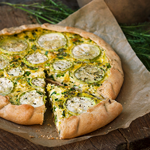Pour le plat, nous vous proposons une quiche de courgettes et fromage de chèvre Petit Billy.