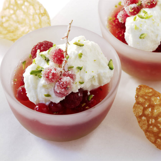 Réservez quelques groseilles et framboises pour la décoration et cuisez les autres dans 15 cl d’eau à feu doux jusqu’à ce que les fruits soient tendres. Écrasez-les à la fourchette et passez-les au tamis fin pour éliminer les pépins.