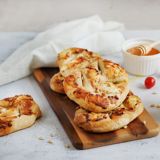 Fougasses individuelles au miel, Chèvre Frais Petit Billy et pignons de pin