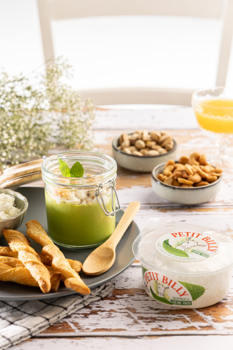 Mixez les petits pois et ajoutez-les à la préparation au mascarpone, salez, poivrez et ajoutez par-dessus du chèvre frais en morceau.