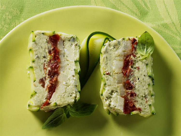 Recouvrez le fond d’un moule à cake tapissé de papier cuisson avec la moitié des courgettes.