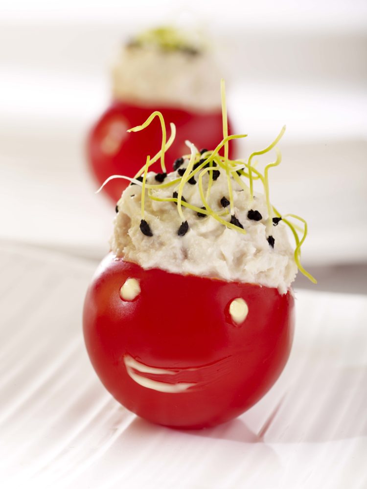 Lavez et séchez les tomates, coupez-leur un chapeau (côté plus fin), creuser-les délicatement, remplissez-les avec le mélange Petit Billy et thon. Saupoudrez de cacahuètes hachées.