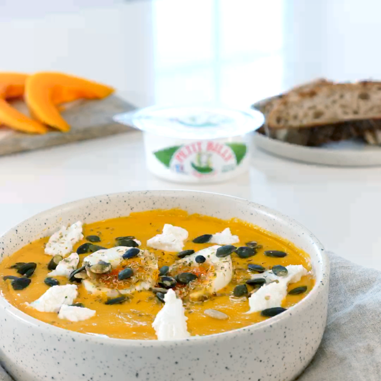 Accompagnez votre délicieux potage avec deux œufs mi-mollet et quelques graines de courge.
